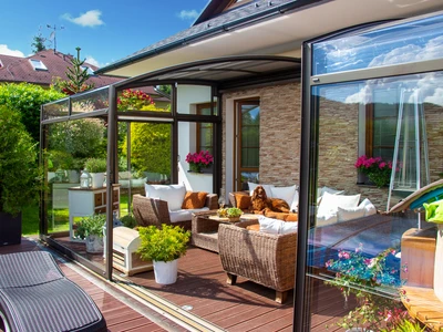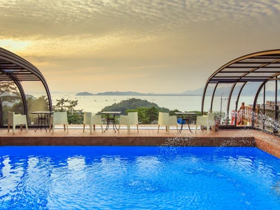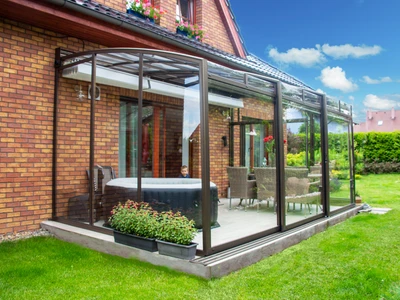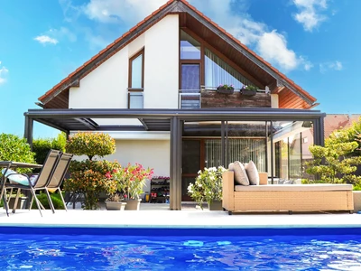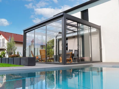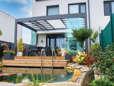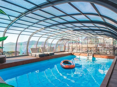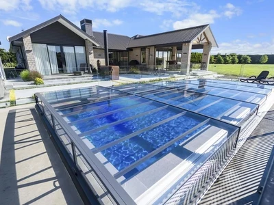 Die Poolüberdachung VIVA™ von Alukov ist eine flache Lösung mit Einzelschienen-System, das barrierefreien Zugang von drei Seiten ermöglicht. Dieses moderne Design schützt den Pool vor Schmutz, beschleunigt das Aufheizen des Wassers und hält die Temperatur über Nacht konstant.