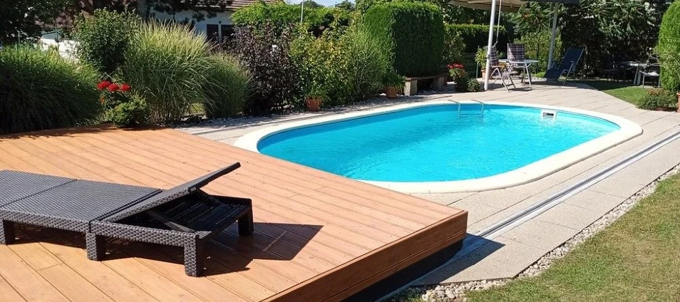 Die Poolüberdachung VIVA™ von Alukov ist eine flache Lösung mit Einzelschienen-System, das barrierefreien Zugang von drei Seiten ermöglicht. Dieses moderne Design schützt den Pool vor Schmutz, beschleunigt das Aufheizen des Wassers und hält die Temperatur über Nacht konstant.