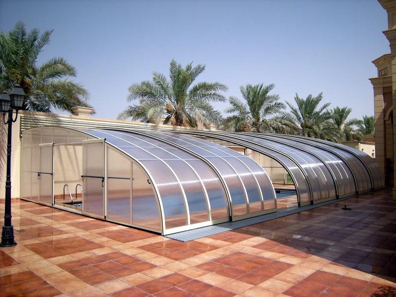 Hohe Überdachungen hingegen schaffen einen voll überdachten Bereich rund um den Pool, der komfortables Schwimmen und Entspannen bei jedem Wetter ermöglicht. Dank der Bewegungsfreiheit über die gesamte Höhe der Konstruktion kann diese Variante auch als geschützter Ruhebereich oder Treffpunkt mit Familie und Freunden genutzt werden. Beide Überdachungstypen bestehen aus langlebigen Materialien, die eine lange Lebensdauer, einfache Wartung und reibungslose Bedienung garantieren.