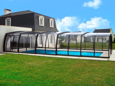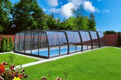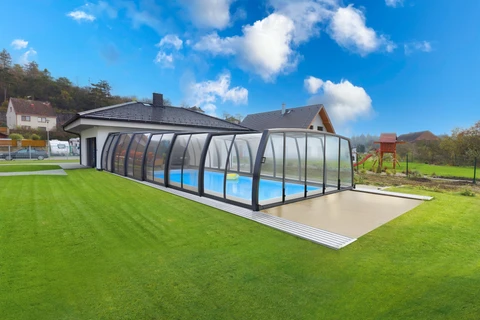 Die Poolüberdachung VIVA™ von Alukov ist eine flache Lösung mit Einzelschienen-System, das barrierefreien Zugang von drei Seiten ermöglicht. Dieses moderne Design schützt den Pool vor Schmutz, beschleunigt das Aufheizen des Wassers und hält die Temperatur über Nacht konstant.