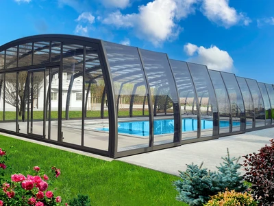 Die Poolüberdachung RAVENA™ kombiniert senkrechte Wände mit gewölbten Segmenten und ermöglicht so freien Zugang von drei Seiten. Dieses moderne Design ist ideal für Pools, die in der Nähe von Gebäuden oder Wänden liegen.