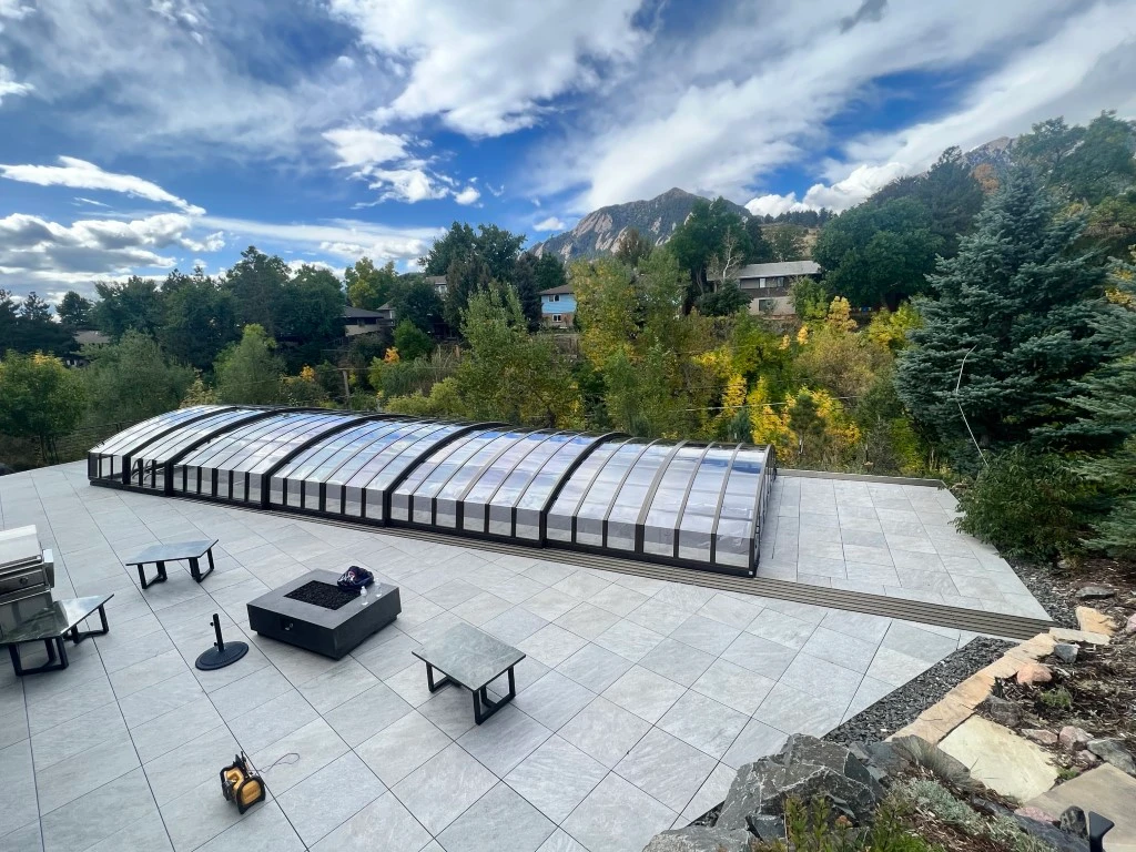Die Poolüberdachung RAVENA™ kombiniert senkrechte Wände mit gewölbten Segmenten und ermöglicht so freien Zugang von drei Seiten. Dieses moderne Design ist ideal für Pools, die in der Nähe von Gebäuden oder Wänden liegen.