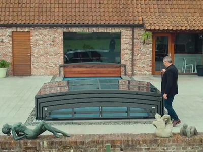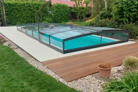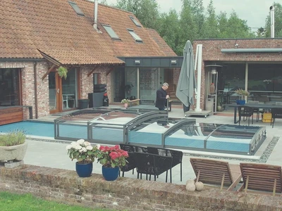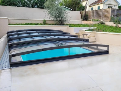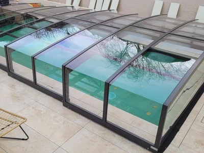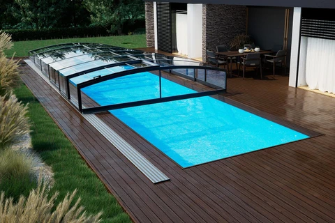 Die Poolüberdachung VIVA™ von Alukov ist eine flache Lösung mit Einzelschienen-System, das barrierefreien Zugang von drei Seiten ermöglicht. Dieses moderne Design schützt den Pool vor Schmutz, beschleunigt das Aufheizen des Wassers und hält die Temperatur über Nacht konstant.