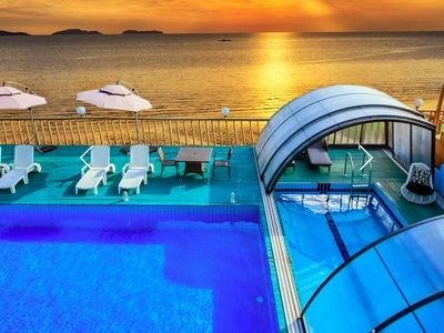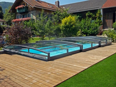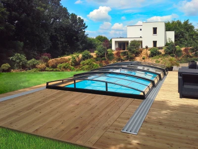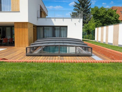 Die Poolüberdachung VIVA™ von Alukov ist eine flache Lösung mit Einzelschienen-System, das barrierefreien Zugang von drei Seiten ermöglicht. Dieses moderne Design schützt den Pool vor Schmutz, beschleunigt das Aufheizen des Wassers und hält die Temperatur über Nacht konstant.