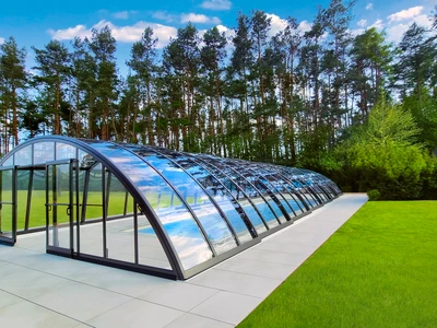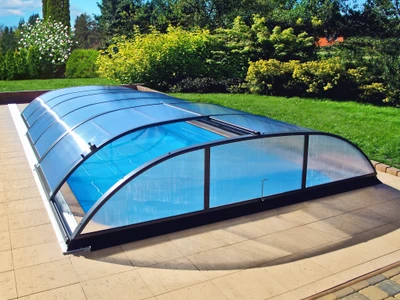 Die Poolüberdachung AZURE Flat ist eine flache Lösung mit elegantem Design, das sich dank des Mehrfachradius-Konzepts harmonisch in moderne Gärten einfügt. Sie ist mit einer Einfachsteg-Polycarbonatfüllung ausgestattet und in Silber oder Anthrazit erhältlich.
