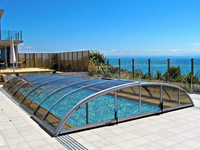 Die Poolüberdachung ELEGANT NEO™ von Alukov bietet eine elegante Form und eine flache Bauweise, die vollen Schutz für Ihren Pool gewährleistet. Dank der optimalen Wölbung ermöglicht sie komfortables Schwimmen selbst bei ungünstigem Wetter, ohne das Erscheinungsbild Ihres Gartens zu beeinträchtigen.
