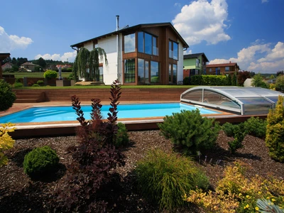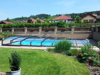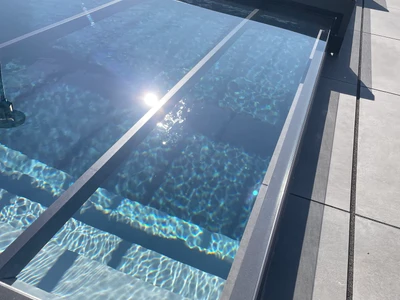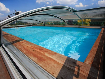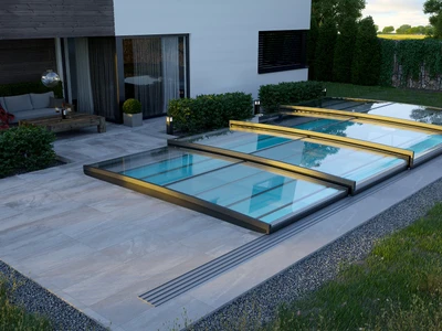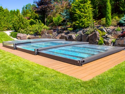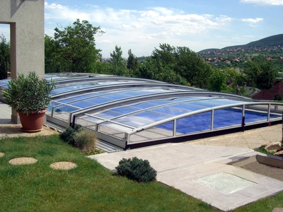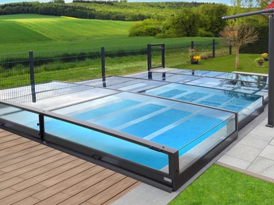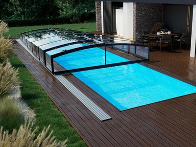 Flache Poolüberdachungen sind die ideale Lösung für alle, die Ästhetik, Funktionalität und Komfort miteinander verbinden möchten. Dank ihres dezenten Profils fügt sich die Überdachung nahtlos in das Gesamtbild des Gartens oder Außenbereichs ein und bietet gleichzeitig vollständigen Schutz des Pools vor Schmutz, widrigem Wetter und Wärmeverlust.