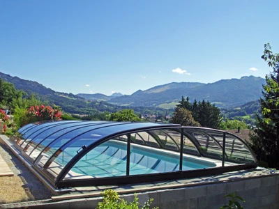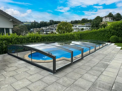 Eleganter Poolschutz mit freiem Blick – niedrige Überdachung für maximalen Komfort und Stil.