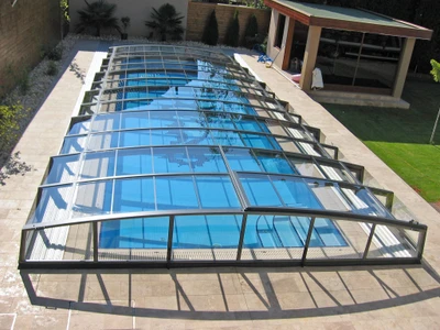 Die Poolüberdachung PARADE ist eine moderne teleskopische Lösung mit leichter Konstruktion und einseitigem Schienensystem. Die transparenten Paneele ermöglichen auch im geschlossenen Zustand einen freien Blick auf den Pool, während Sicherheitsschlösser unbefugten Zugang verhindern.
