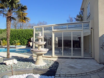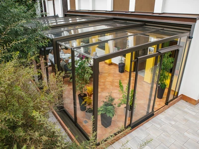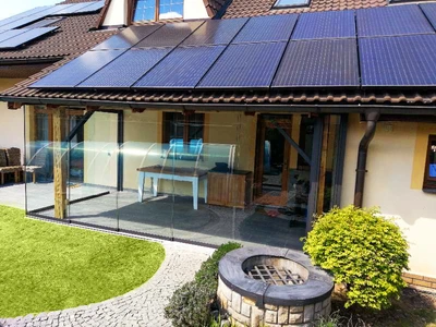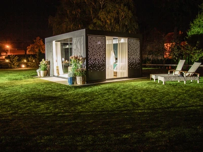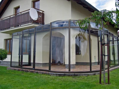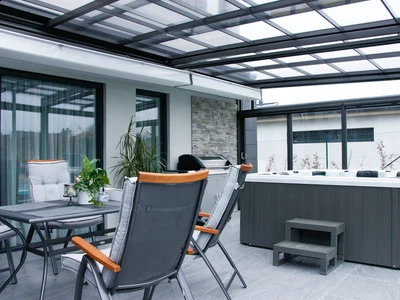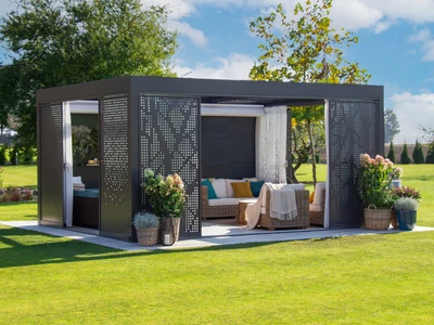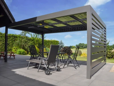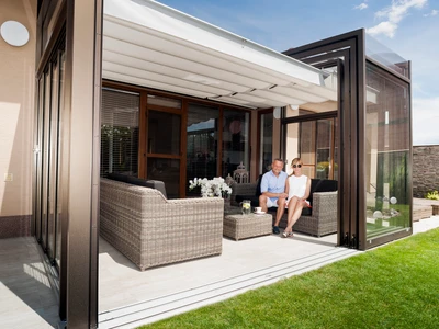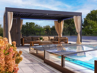 Wählen Sie aus unserem Sortiment an bioklimatischen Pergolen oder dem einzigartigen Schiebesystem für Terrassenüberdachungen CORSO. Beide Lösungen sind zertifiziert für die Montage an Holzhäusern.